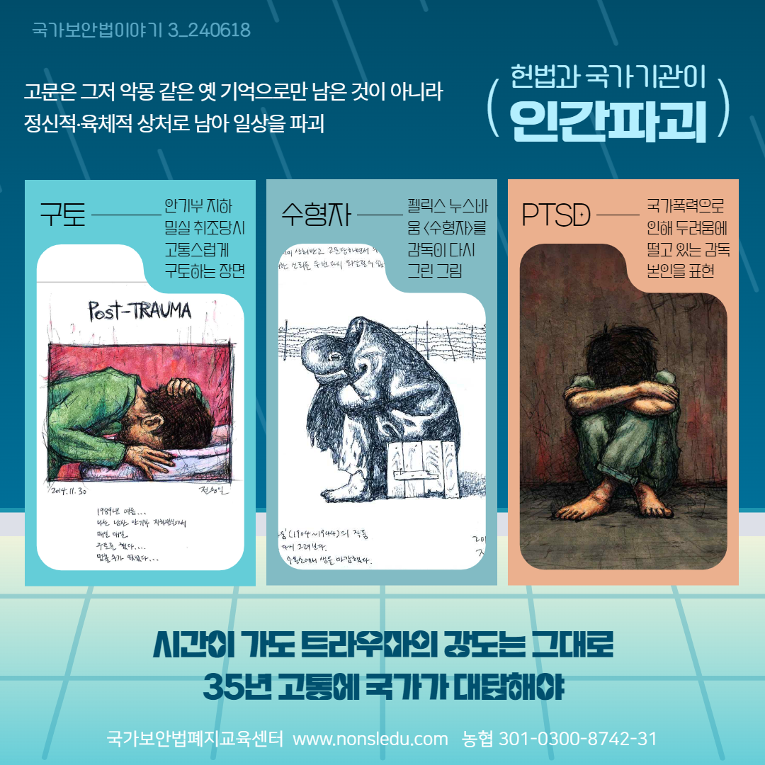 헌법과 국가기관이 인간 파괴. 고문은 그저 악몽 같은 옛 기억이 아니라 정신적, 육체적 상처로 남아 일상을 파괴