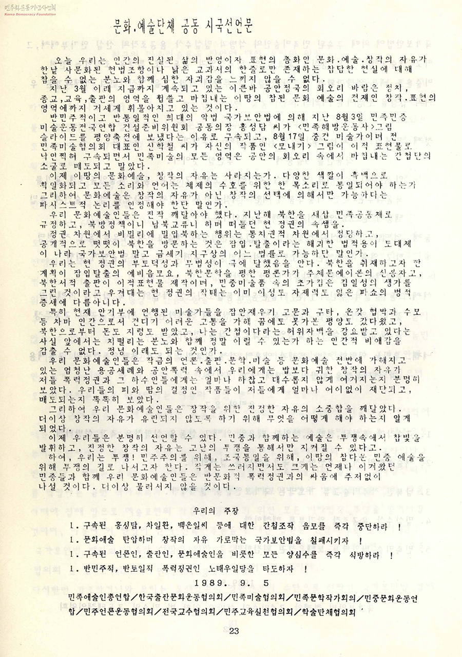 민족예술인총연합/한국출판문화운동협의회/민족미술협의회/민족문학작가회의/민중문화운동연합/민주언론운동협의회/전국교수협의회/민주교육실천협의회/학술단체협의회